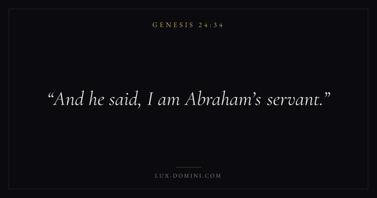 Books / Genesis / Chapter 24 / Verse 34 ← Genesis 24:33 Genesis 24:34 Genesis 24:35 → And he said, I am Abraham’s servant. Download verse card Share on Twitter Share on Facebook Pin it ✦ Key themes HopeCreationFallCovenant Read with Genesis 24:32Genesis 24:33Romans 8:24Revelation 21:4 Related topics Bible verses about hope ✦ Genesis Chapter 24 verses V. 1 V. 2 V. 3 V. 4 V. 5 V. 6 V. 7 V. 8 V. 9 V. 10 V. 11 V. 12 V. 13 V. 14 V. 15 V. 16 V. 17 V. 18 V. 19 V. 20 V. 21 V. 22 V. 23 V. 24 V. 25 V. 26 V. 27 V. 28 V. 29 V. 30 V. 31 V. 32 V. 33 V. 34 V. 35 V. 36 V. 37 V. 38 V. 39 V. 40 V. 41 V. 42 V. 43 V. 44 V. 45 V. 46 V. 47 V. 48 V. 49 V. 50 V. 51 V. 52 V. 53 V. 54 V. 55 V. 56 V. 57 V. 58 V. 59 V. 60 V. 61 V. 62 V. 63 V. 64 V. 65 V. 66 V. 67