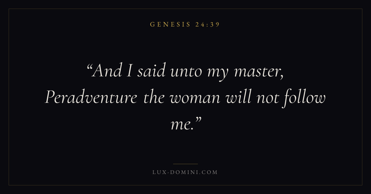Books / Genesis / Chapter 24 / Verse 39 ← Genesis 24:38 Genesis 24:39 Genesis 24:40 → And I said unto my master, Peradventure the woman will not follow me. Download verse card Share on Twitter Share on Facebook Pin it ✦ Key themes HopeCreationFallCovenant Read with Genesis 24:37Genesis 24:38Romans 8:24Revelation 21:4 Related topics Bible verses about hope ✦ Genesis Chapter 24 verses V. 1 V. 2 V. 3 V. 4 V. 5 V. 6 V. 7 V. 8 V. 9 V. 10 V. 11 V. 12 V. 13 V. 14 V. 15 V. 16 V. 17 V. 18 V. 19 V. 20 V. 21 V. 22 V. 23 V. 24 V. 25 V. 26 V. 27 V. 28 V. 29 V. 30 V. 31 V. 32 V. 33 V. 34 V. 35 V. 36 V. 37 V. 38 V. 39 V. 40 V. 41 V. 42 V. 43 V. 44 V. 45 V. 46 V. 47 V. 48 V. 49 V. 50 V. 51 V. 52 V. 53 V. 54 V. 55 V. 56 V. 57 V. 58 V. 59 V. 60 V. 61 V. 62 V. 63 V. 64 V. 65 V. 66 V. 67