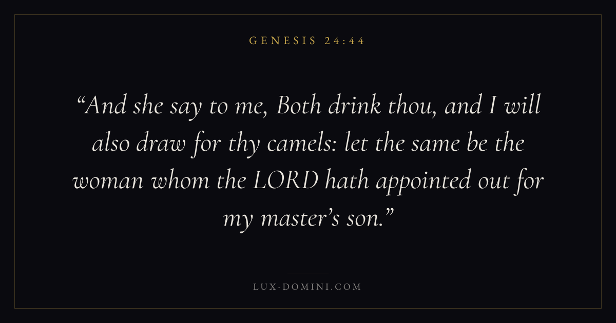 And she say to me, Both drink thou, and I will also draw for thy camels: let the same be the woman whom the LORD hath appointed out for my master’s son.