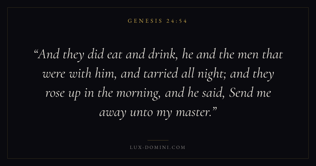 And they did eat and drink, he and the men that were with him, and tarried all night; and they rose up in the morning, and he said, Send me away unto my master.
