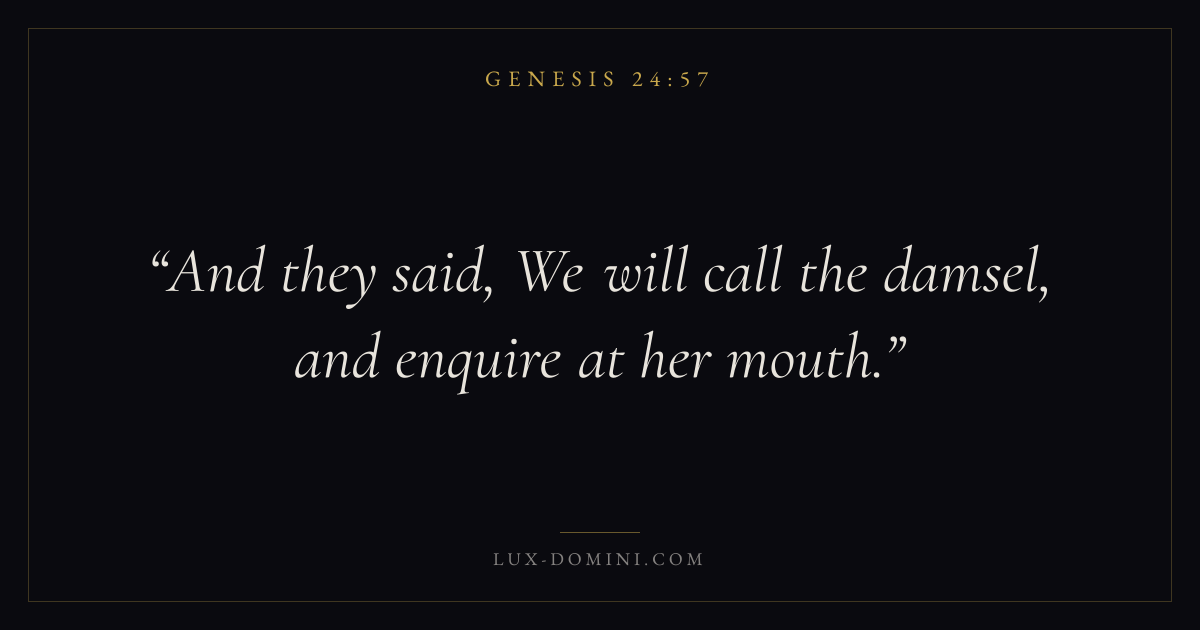 Books / Genesis / Chapter 24 / Verse 57 ← Genesis 24:56 Genesis 24:57 Genesis 24:58 → And they said, We will call the damsel, and enquire at her mouth. Download verse card Share on Twitter Share on Facebook Pin it ✦ Key themes HopeWisdomCreationFall Read with Genesis 24:54Genesis 24:55Romans 8:24Revelation 21:4 Related topics Bible verses about hopeBible verses about wisdom ✦ Genesis Chapter 24 verses V. 1 V. 2 V. 3 V. 4 V. 5 V. 6 V. 7 V. 8 V. 9 V. 10 V. 11 V. 12 V. 13 V. 14 V. 15 V. 16 V. 17 V. 18 V. 19 V. 20 V. 21 V. 22 V. 23 V. 24 V. 25 V. 26 V. 27 V. 28 V. 29 V. 30 V. 31 V. 32 V. 33 V. 34 V. 35 V. 36 V. 37 V. 38 V. 39 V. 40 V. 41 V. 42 V. 43 V. 44 V. 45 V. 46 V. 47 V. 48 V. 49 V. 50 V. 51 V. 52 V. 53 V. 54 V. 55 V. 56 V. 57 V. 58 V. 59 V. 60 V. 61 V. 62 V. 63 V. 64 V. 65 V. 66 V. 67