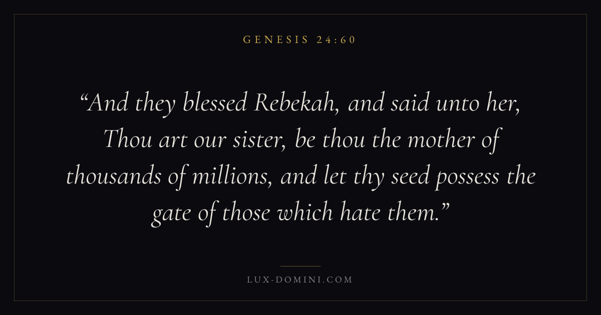 And they blessed Rebekah, and said unto her, Thou art our sister, be thou the mother of thousands of millions, and let thy seed possess the gate of those which hate them.