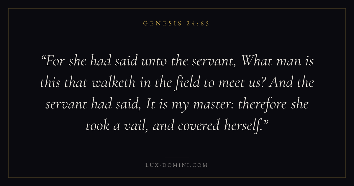 For she had said unto the servant, What man is this that walketh in the field to meet us? And the servant had said, It is my master: therefore she took a vail, and covered herself.