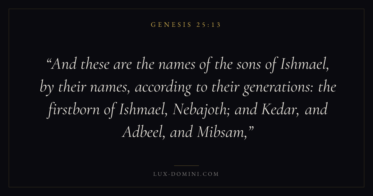 And these are the names of the sons of Ishmael, by their names, according to their generations: the firstborn of Ishmael, Nebajoth; and Kedar, and Adbeel, and Mibsam,