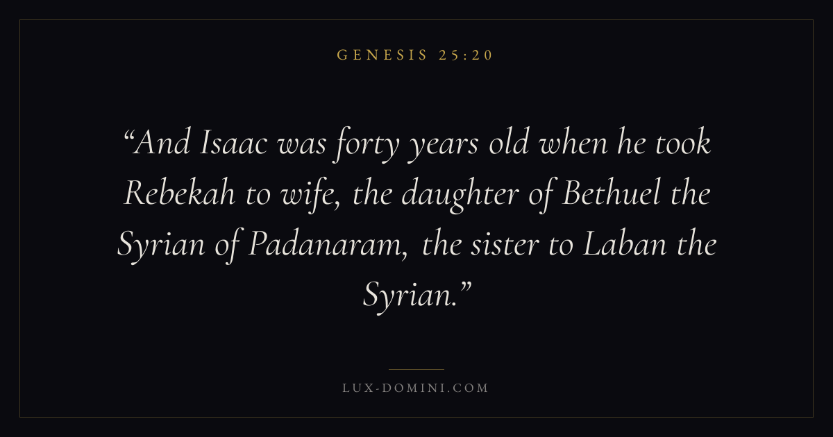 And Isaac was forty years old when he took Rebekah to wife, the daughter of Bethuel the Syrian of Padanaram, the sister to Laban the Syrian.