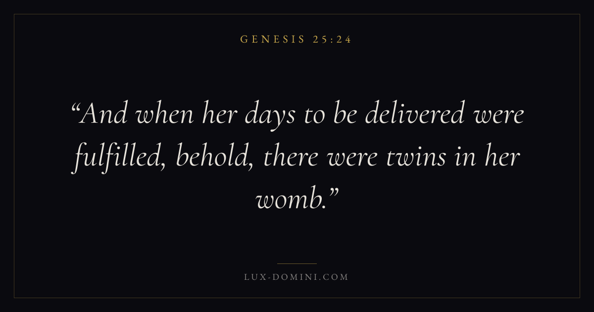 Books / Genesis / Chapter 25 / Verse 24 ← Genesis 25:23 Genesis 25:24 Genesis 25:25 → And when her days to be delivered were fulfilled, behold, there were twins in her womb. Download verse card Share on Twitter Share on Facebook Pin it ✦ Key themes HopePrayerPeaceCreation Read with Genesis 25:25Genesis 25:26Romans 8:24Revelation 21:4 Related topics Bible verses about hopeBible verses about prayerBible verses about peace ✦ Genesis Chapter 25 verses V. 1 V. 2 V. 3 V. 4 V. 5 V. 6 V. 7 V. 8 V. 9 V. 10 V. 11 V. 12 V. 13 V. 14 V. 15 V. 16 V. 17 V. 18 V. 19 V. 20 V. 21 V. 22 V. 23 V. 24 V. 25 V. 26 V. 27 V. 28 V. 29 V. 30 V. 31 V. 32 V. 33 V. 34