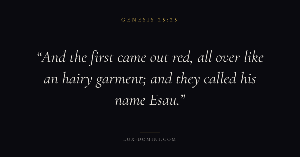 Books / Genesis / Chapter 25 / Verse 25 ← Genesis 25:24 Genesis 25:25 Genesis 25:26 → And the first came out red, all over like an hairy garment; and they called his name Esau. Download verse card Share on Twitter Share on Facebook Pin it ✦ Key themes HopePrayerPeaceCreation Read with Genesis 25:24Genesis 25:26Romans 8:24Revelation 21:4 Related topics Bible verses about hopeBible verses about prayerBible verses about peace ✦ Genesis Chapter 25 verses V. 1 V. 2 V. 3 V. 4 V. 5 V. 6 V. 7 V. 8 V. 9 V. 10 V. 11 V. 12 V. 13 V. 14 V. 15 V. 16 V. 17 V. 18 V. 19 V. 20 V. 21 V. 22 V. 23 V. 24 V. 25 V. 26 V. 27 V. 28 V. 29 V. 30 V. 31 V. 32 V. 33 V. 34