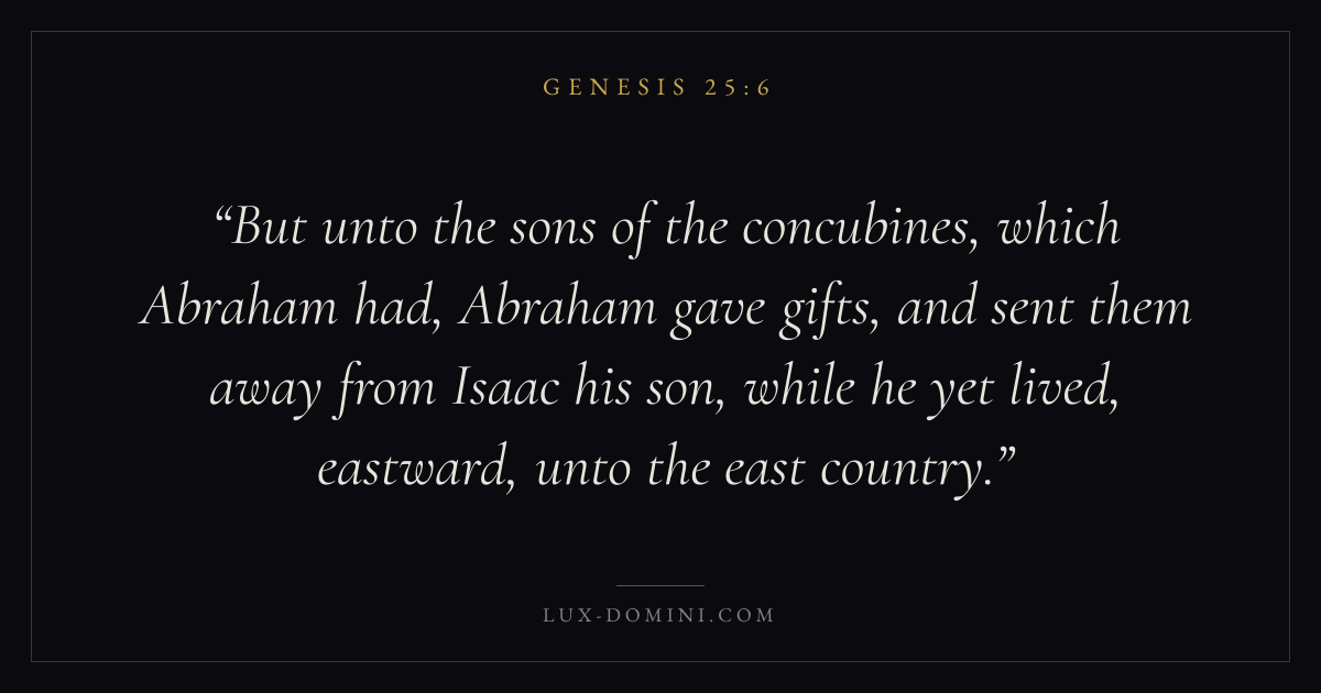 But unto the sons of the concubines, which Abraham had, Abraham gave gifts, and sent them away from Isaac his son, while he yet lived, eastward, unto the east country.
