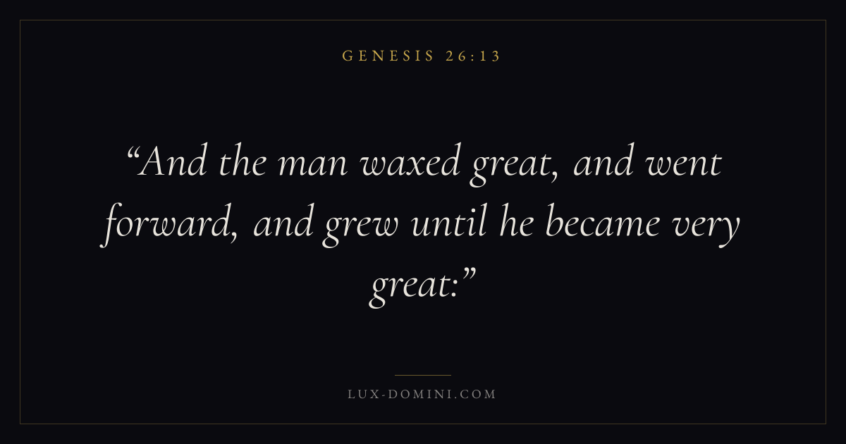 Books / Genesis / Chapter 26 / Verse 13 ← Genesis 26:12 Genesis 26:13 Genesis 26:14 → And the man waxed great, and went forward, and grew until he became very great: Download verse card Share on Twitter Share on Facebook Pin it ✦ Key themes HopeJustice and mercyCreationFall Read with Genesis 26:12Genesis 26:14Romans 8:24Revelation 21:4 Related topics Bible verses about hopeBible verses about justice and mercy ✦ Genesis Chapter 26 verses V. 1 V. 2 V. 3 V. 4 V. 5 V. 6 V. 7 V. 8 V. 9 V. 10 V. 11 V. 12 V. 13 V. 14 V. 15 V. 16 V. 17 V. 18 V. 19 V. 20 V. 21 V. 22 V. 23 V. 24 V. 25 V. 26 V. 27 V. 28 V. 29 V. 30 V. 31 V. 32 V. 33 V. 34 V. 35