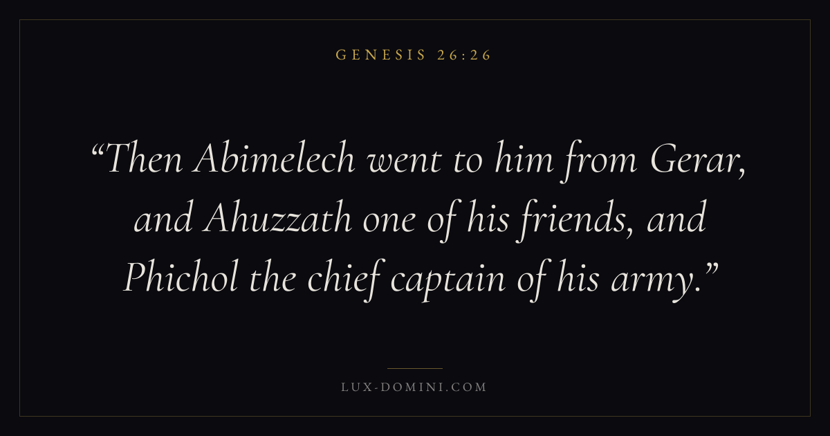Then Abimelech went to him from Gerar, and Ahuzzath one of his friends, and Phichol the chief captain of his army.