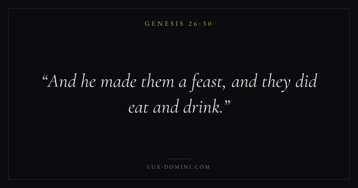 Books / Genesis / Chapter 26 / Verse 30 ← Genesis 26:29 Genesis 26:30 Genesis 26:31 → And he made them a feast, and they did eat and drink. Download verse card Share on Twitter Share on Facebook Pin it ✦ Key themes HopePeaceCreationFall Read with Genesis 26:26Genesis 26:27Romans 8:24Revelation 21:4 Related topics Bible verses about hopeBible verses about peace ✦ Genesis Chapter 26 verses V. 1 V. 2 V. 3 V. 4 V. 5 V. 6 V. 7 V. 8 V. 9 V. 10 V. 11 V. 12 V. 13 V. 14 V. 15 V. 16 V. 17 V. 18 V. 19 V. 20 V. 21 V. 22 V. 23 V. 24 V. 25 V. 26 V. 27 V. 28 V. 29 V. 30 V. 31 V. 32 V. 33 V. 34 V. 35