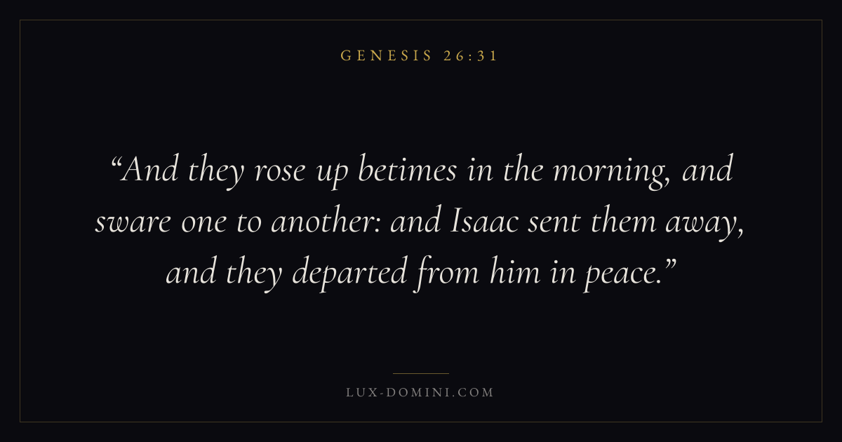 And they rose up betimes in the morning, and sware one to another: and Isaac sent them away, and they departed from him in peace.