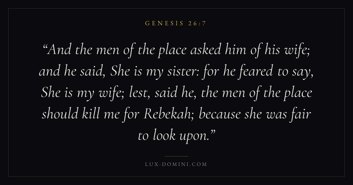 And the men of the place asked him of his wife; and he said, She is my sister: for he feared to say, She is my wife; lest, said he, the men of the place should kill me for Rebekah; because she was fair to look upon.