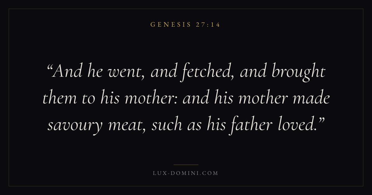 And he went, and fetched, and brought them to his mother: and his mother made savoury meat, such as his father loved.