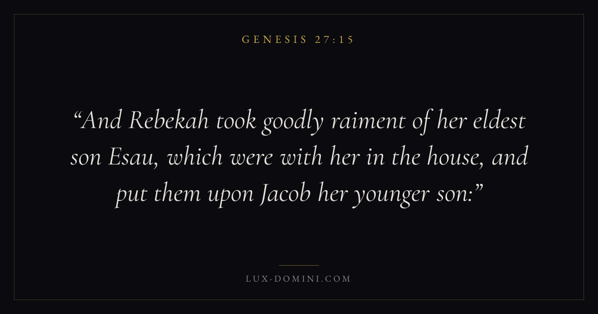 And Rebekah took goodly raiment of her eldest son Esau, which were with her in the house, and put them upon Jacob her younger son: