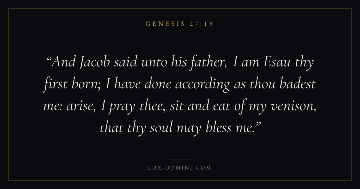 And Jacob said unto his father, I am Esau thy first born; I have done according as thou badest me: arise, I pray thee, sit and eat of my venison, that thy soul may bless me.
