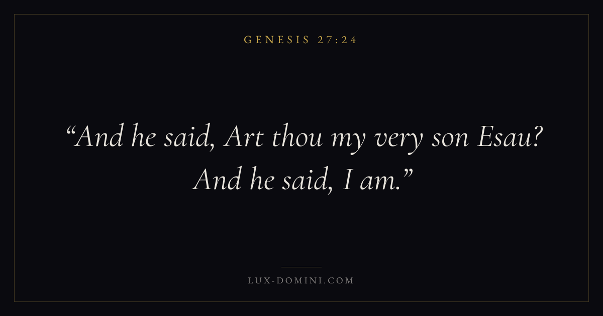 Books / Genesis / Chapter 27 / Verse 24 ← Genesis 27:23 Genesis 27:24 Genesis 27:25 → And he said, Art thou my very son Esau? And he said, I am. Download verse card Share on Twitter Share on Facebook Pin it ✦ Key themes HopeCreationFallCovenant Read with Genesis 27:23Genesis 27:25Romans 8:24Revelation 21:4 Related topics Bible verses about hope ✦ Genesis Chapter 27 verses V. 1 V. 2 V. 3 V. 4 V. 5 V. 6 V. 7 V. 8 V. 9 V. 10 V. 11 V. 12 V. 13 V. 14 V. 15 V. 16 V. 17 V. 18 V. 19 V. 20 V. 21 V. 22 V. 23 V. 24 V. 25 V. 26 V. 27 V. 28 V. 29 V. 30 V. 31 V. 32 V. 33 V. 34 V. 35 V. 36 V. 37 V. 38 V. 39 V. 40 V. 41 V. 42 V. 43 V. 44 V. 45 V. 46