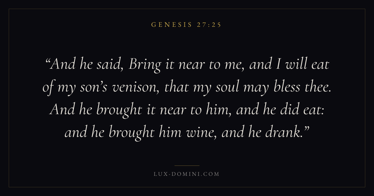 And he said, Bring it near to me, and I will eat of my son’s venison, that my soul may bless thee. And he brought it near to him, and he did eat: and he brought him wine, and he drank.