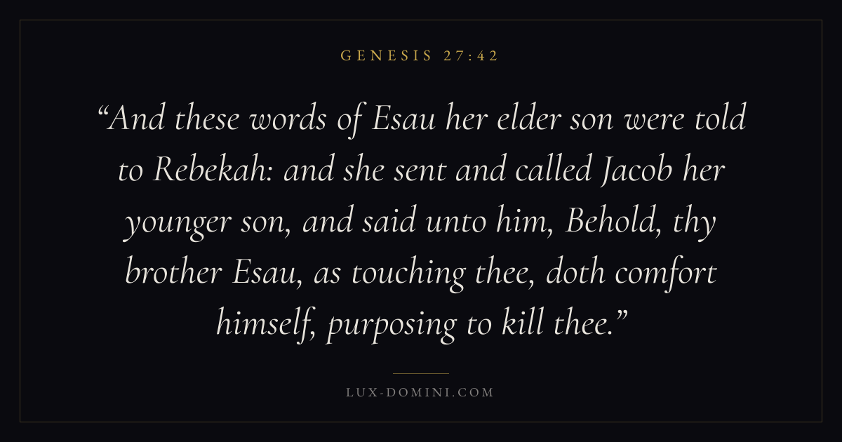 And these words of Esau her elder son were told to Rebekah: and she sent and called Jacob her younger son, and said unto him, Behold, thy brother Esau, as touching thee, doth comfort himself, purposing to kill thee.