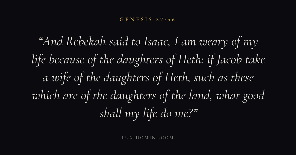 And Rebekah said to Isaac, I am weary of my life because of the daughters of Heth: if Jacob take a wife of the daughters of Heth, such as these which are of the daughters of the land, what good shall my life do me?