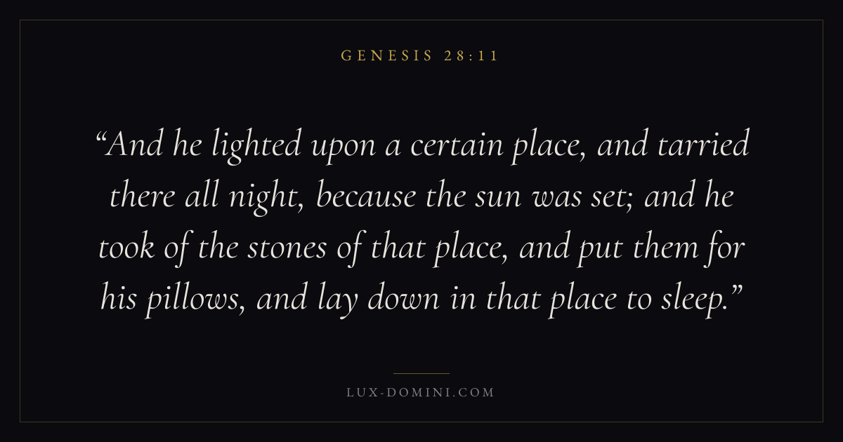 And he lighted upon a certain place, and tarried there all night, because the sun was set; and he took of the stones of that place, and put them for his pillows, and lay down in that place to sleep.