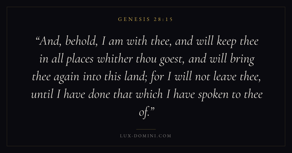 And, behold, I am with thee, and will keep thee in all places whither thou goest, and will bring thee again into this land; for I will not leave thee, until I have done that which I have spoken to thee of.