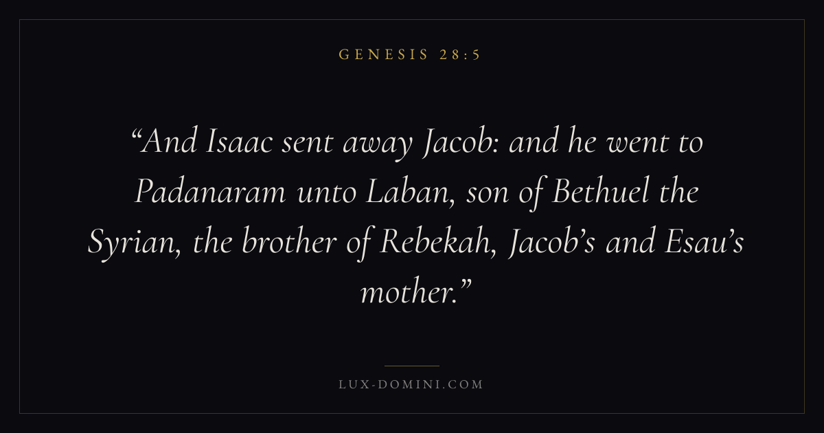 And Isaac sent away Jacob: and he went to Padanaram unto Laban, son of Bethuel the Syrian, the brother of Rebekah, Jacob’s and Esau’s mother.