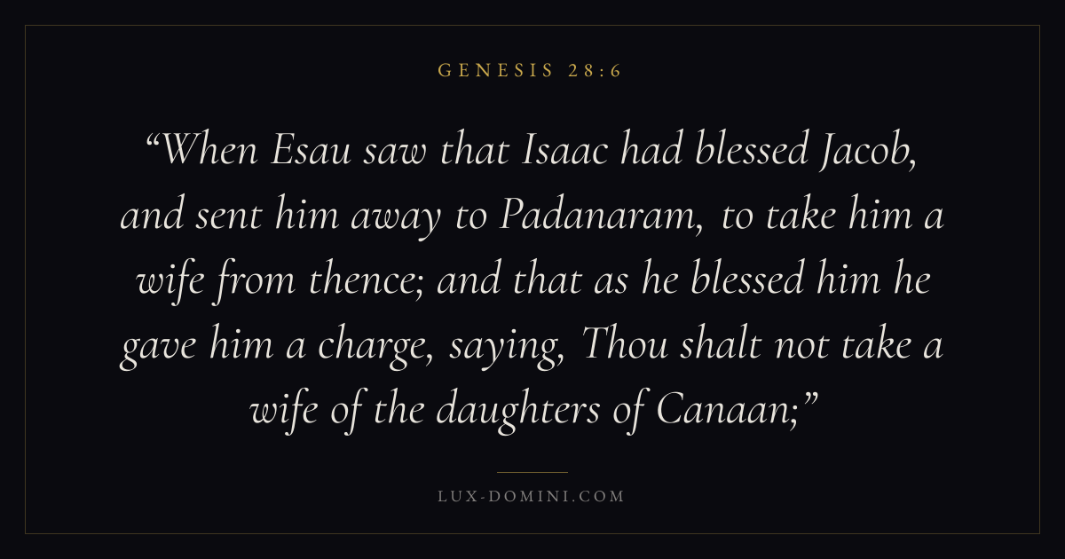 When Esau saw that Isaac had blessed Jacob, and sent him away to Padanaram, to take him a wife from thence; and that as he blessed him he gave him a charge, saying, Thou shalt not take a wife of the daughters of Canaan;