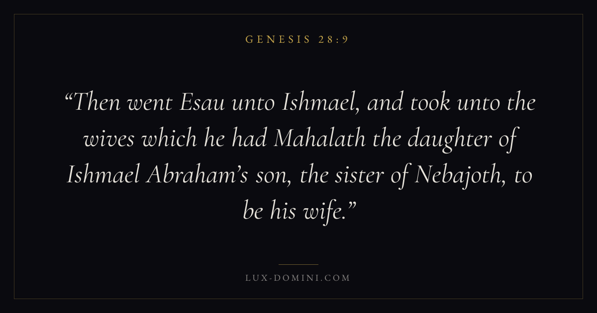 Then went Esau unto Ishmael, and took unto the wives which he had Mahalath the daughter of Ishmael Abraham’s son, the sister of Nebajoth, to be his wife.