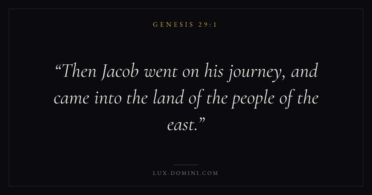 Books / Genesis / Chapter 29 / Verse 1 ← Genesis 28:22 Genesis 29:1 Genesis 29:2 → Then Jacob went on his journey, and came into the land of the people of the east. Download verse card Share on Twitter Share on Facebook Pin it ✦ Key themes HopeCreationFallCovenant Read with Genesis 29:2Genesis 29:3Romans 8:24Revelation 21:4 Related topics Bible verses about hope Glossary East Place (1. ) The orient (mizrah); the rising of the sun. Thus “the east country” is the country lying to the east of Syria, the Elymais ( Zech. 8:7 ). (2). Modern identification: Amman. ✦ Genesis Chapter 29 verses V. 1 V. 2 V. 3 V. 4 V. 5 V. 6 V. 7 V. 8 V. 9 V. 10 V. 11 V. 12 V. 13 V. 14 V. 15 V. 16 V. 17 V. 18 V. 19 V. 20 V. 21 V. 22 V. 23 V. 24 V. 25 V. 26 V. 27 V. 28 V. 29 V. 30 V. 31 V. 32 V. 33 V. 34 V. 35