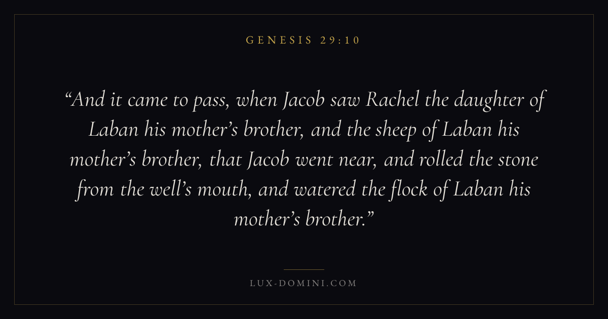 And it came to pass, when Jacob saw Rachel the daughter of Laban his mother’s brother, and the sheep of Laban his mother’s brother, that Jacob went near, and rolled the stone from the well’s mouth, and watered the flock of Laban his mother’s brother.