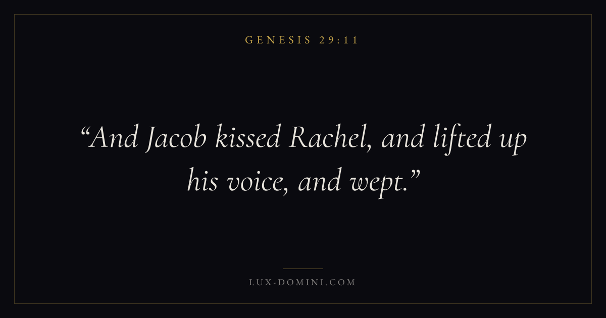 Books / Genesis / Chapter 29 / Verse 11 ← Genesis 29:10 Genesis 29:11 Genesis 29:12 → And Jacob kissed Rachel, and lifted up his voice, and wept. Download verse card Share on Twitter Share on Facebook Pin it ✦ Key themes HopeHumilityCreationFall Read with Genesis 29:9Genesis 29:10Romans 8:24Revelation 21:4 Related topics Bible verses about hopeBible verses about humility Glossary Rachel Person Ewe, “the daughter”, “the somewhat petulant, peevish, and self-willed though beautiful younger daughter” of Laban, and one of Jacob’s wives ( Gen. 29:6 , 28). ✦ Genesis Chapter 29 verses V. 1 V. 2 V. 3 V. 4 V. 5 V. 6 V. 7 V. 8 V. 9 V. 10 V. 11 V. 12 V. 13 V. 14 V. 15 V. 16 V. 17 V. 18 V. 19 V. 20 V. 21 V. 22 V. 23 V. 24 V. 25 V. 26 V. 27 V. 28 V. 29 V. 30 V. 31 V. 32 V. 33 V. 34 V. 35