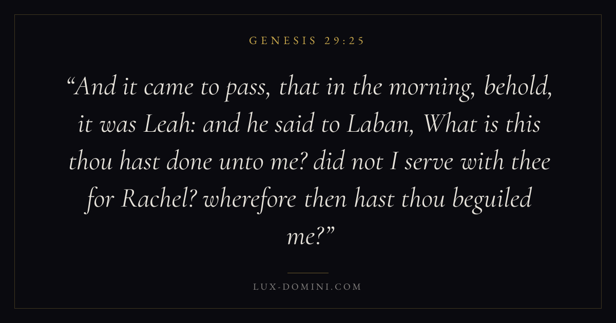 And it came to pass, that in the morning, behold, it was Leah: and he said to Laban, What is this thou hast done unto me? did not I serve with thee for Rachel? wherefore then hast thou beguiled me?