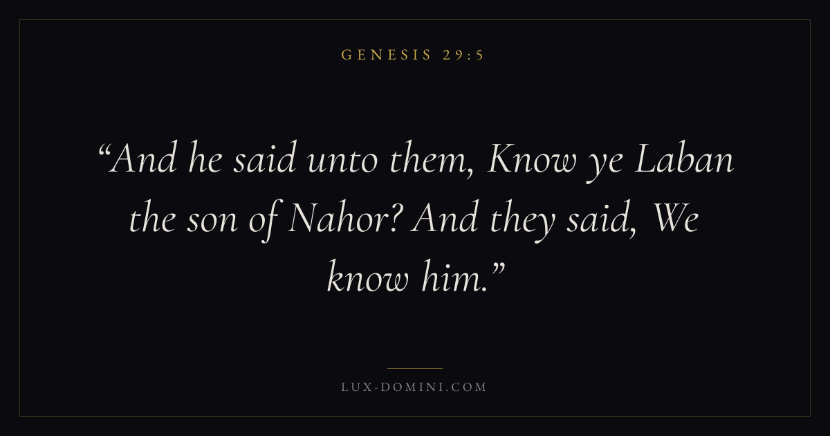 Books / Genesis / Chapter 29 / Verse 5 ← Genesis 29:4 Genesis 29:5 Genesis 29:6 → And he said unto them, Know ye Laban the son of Nahor? And they said, We know him. Download verse card Share on Twitter Share on Facebook Pin it ✦ Key themes HopeCreationFallCovenant Read with Genesis 29:1Genesis 29:2Romans 8:24Revelation 21:4 Related topics Bible verses about hope ✦ Genesis Chapter 29 verses V. 1 V. 2 V. 3 V. 4 V. 5 V. 6 V. 7 V. 8 V. 9 V. 10 V. 11 V. 12 V. 13 V. 14 V. 15 V. 16 V. 17 V. 18 V. 19 V. 20 V. 21 V. 22 V. 23 V. 24 V. 25 V. 26 V. 27 V. 28 V. 29 V. 30 V. 31 V. 32 V. 33 V. 34 V. 35