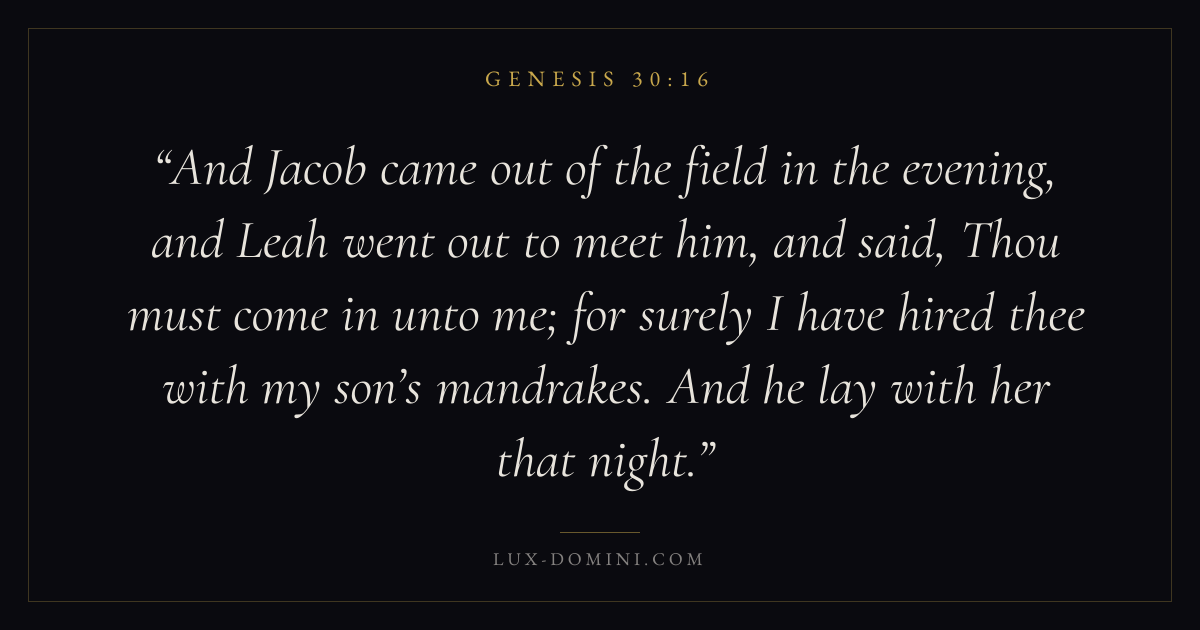 And Jacob came out of the field in the evening, and Leah went out to meet him, and said, Thou must come in unto me; for surely I have hired thee with my son’s mandrakes. And he lay with her that night.