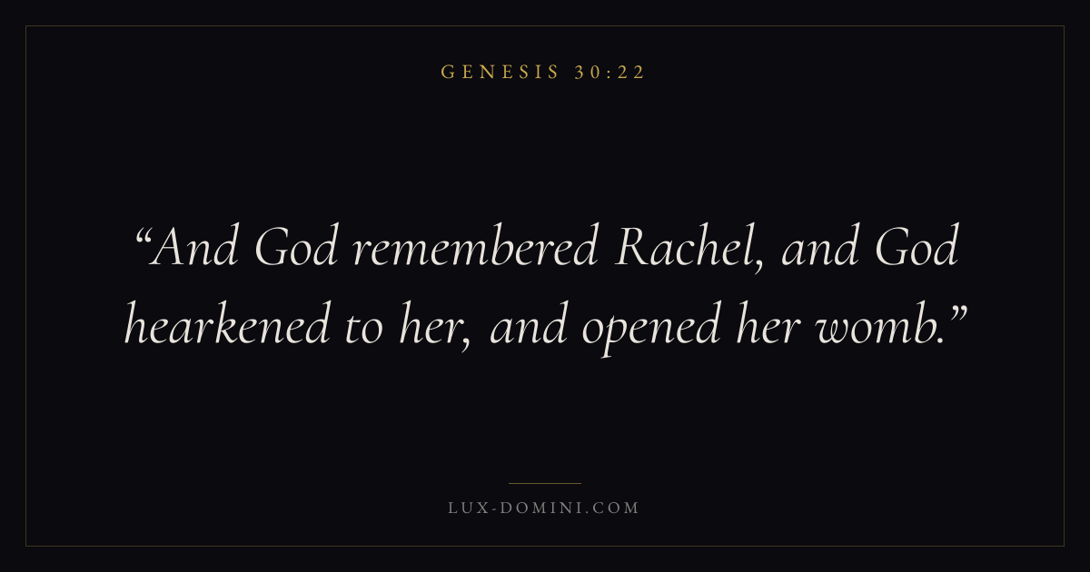 Books / Genesis / Chapter 30 / Verse 22 ← Genesis 30:21 Genesis 30:22 Genesis 30:23 → And God remembered Rachel, and God hearkened to her, and opened her womb. Download verse card Share on Twitter Share on Facebook Pin it ✦ Key themes HopeCreationFallCovenant Read with Genesis 30:23Genesis 30:24Romans 8:24Revelation 21:4 Related topics Bible verses about hope Glossary Rachel Person Ewe, “the daughter”, “the somewhat petulant, peevish, and self-willed though beautiful younger daughter” of Laban, and one of Jacob’s wives ( Gen. 29:6 , 28). ✦ Genesis Chapter 30 verses V. 1 V. 2 V. 3 V. 4 V. 5 V. 6 V. 7 V. 8 V. 9 V. 10 V. 11 V. 12 V. 13 V. 14 V. 15 V. 16 V. 17 V. 18 V. 19 V. 20 V. 21 V. 22 V. 23 V. 24 V. 25 V. 26 V. 27 V. 28 V. 29 V. 30 V. 31 V. 32 V. 33 V. 34 V. 35 V. 36 V. 37 V. 38 V. 39 V. 40 V. 41 V. 42 V. 43