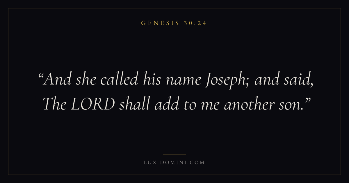 Books / Genesis / Chapter 30 / Verse 24 ← Genesis 30:23 Genesis 30:24 Genesis 30:25 → And she called his name Joseph; and said, The LORD shall add to me another son. Download verse card Share on Twitter Share on Facebook Pin it ✦ Key themes HopeCreationFallCovenant Read with Genesis 30:22Genesis 30:23Romans 8:24Revelation 21:4 Related topics Bible verses about hope ✦ Genesis Chapter 30 verses V. 1 V. 2 V. 3 V. 4 V. 5 V. 6 V. 7 V. 8 V. 9 V. 10 V. 11 V. 12 V. 13 V. 14 V. 15 V. 16 V. 17 V. 18 V. 19 V. 20 V. 21 V. 22 V. 23 V. 24 V. 25 V. 26 V. 27 V. 28 V. 29 V. 30 V. 31 V. 32 V. 33 V. 34 V. 35 V. 36 V. 37 V. 38 V. 39 V. 40 V. 41 V. 42 V. 43