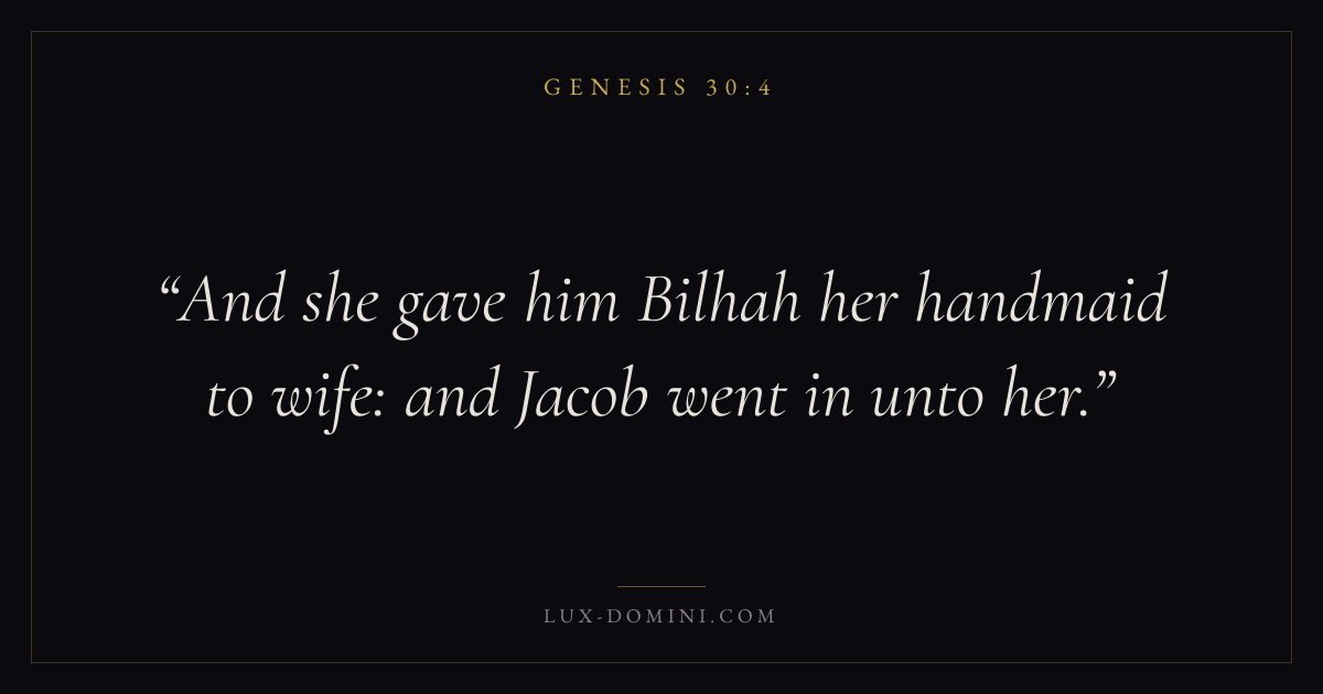 Books / Genesis / Chapter 30 / Verse 4 ← Genesis 30:3 Genesis 30:4 Genesis 30:5 → And she gave him Bilhah her handmaid to wife: and Jacob went in unto her. Download verse card Share on Twitter Share on Facebook Pin it ✦ Key themes HopeCreationFallCovenant Read with Genesis 30:1Genesis 30:2Romans 8:24Revelation 21:4 Related topics Bible verses about hope ✦ Genesis Chapter 30 verses V. 1 V. 2 V. 3 V. 4 V. 5 V. 6 V. 7 V. 8 V. 9 V. 10 V. 11 V. 12 V. 13 V. 14 V. 15 V. 16 V. 17 V. 18 V. 19 V. 20 V. 21 V. 22 V. 23 V. 24 V. 25 V. 26 V. 27 V. 28 V. 29 V. 30 V. 31 V. 32 V. 33 V. 34 V. 35 V. 36 V. 37 V. 38 V. 39 V. 40 V. 41 V. 42 V. 43
