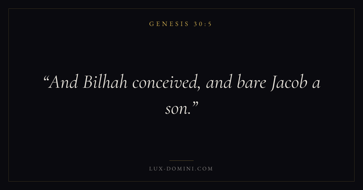 Books / Genesis / Chapter 30 / Verse 5 ← Genesis 30:4 Genesis 30:5 Genesis 30:6 → And Bilhah conceived, and bare Jacob a son. Download verse card Share on Twitter Share on Facebook Pin it ✦ Key themes HopeCreationFallCovenant Read with Genesis 30:1Genesis 30:2Romans 8:24Revelation 21:4 Related topics Bible verses about hope ✦ Genesis Chapter 30 verses V. 1 V. 2 V. 3 V. 4 V. 5 V. 6 V. 7 V. 8 V. 9 V. 10 V. 11 V. 12 V. 13 V. 14 V. 15 V. 16 V. 17 V. 18 V. 19 V. 20 V. 21 V. 22 V. 23 V. 24 V. 25 V. 26 V. 27 V. 28 V. 29 V. 30 V. 31 V. 32 V. 33 V. 34 V. 35 V. 36 V. 37 V. 38 V. 39 V. 40 V. 41 V. 42 V. 43
