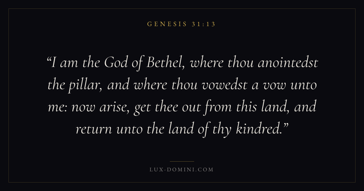 I am the God of Bethel, where thou anointedst the pillar, and where thou vowedst a vow unto me: now arise, get thee out from this land, and return unto the land of thy kindred.