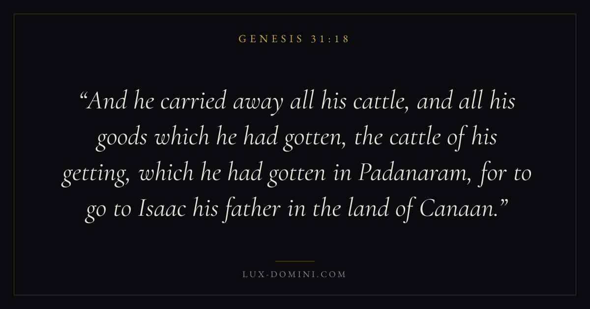 And he carried away all his cattle, and all his goods which he had gotten, the cattle of his getting, which he had gotten in Padanaram, for to go to Isaac his father in the land of Canaan.
