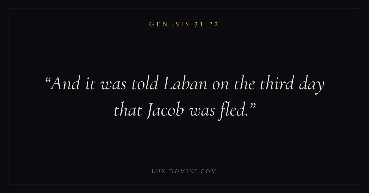 Books / Genesis / Chapter 31 / Verse 22 ← Genesis 31:21 Genesis 31:22 Genesis 31:23 → And it was told Laban on the third day that Jacob was fled. Download verse card Share on Twitter Share on Facebook Pin it ✦ Key themes LoveHopeCreationFall Read with Genesis 31:23Genesis 31:24John 3:161 Corinthians 13:4 Related topics Bible verses about loveBible verses about hope ✦ Genesis Chapter 31 verses V. 1 V. 2 V. 3 V. 4 V. 5 V. 6 V. 7 V. 8 V. 9 V. 10 V. 11 V. 12 V. 13 V. 14 V. 15 V. 16 V. 17 V. 18 V. 19 V. 20 V. 21 V. 22 V. 23 V. 24 V. 25 V. 26 V. 27 V. 28 V. 29 V. 30 V. 31 V. 32 V. 33 V. 34 V. 35 V. 36 V. 37 V. 38 V. 39 V. 40 V. 41 V. 42 V. 43 V. 44 V. 45 V. 46 V. 47 V. 48 V. 49 V. 50 V. 51 V. 52 V. 53 V. 54 V. 55