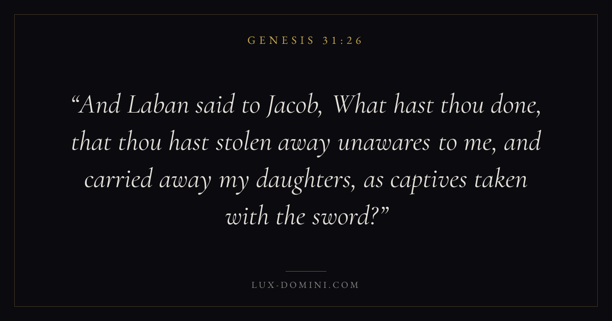 And Laban said to Jacob, What hast thou done, that thou hast stolen away unawares to me, and carried away my daughters, as captives taken with the sword?