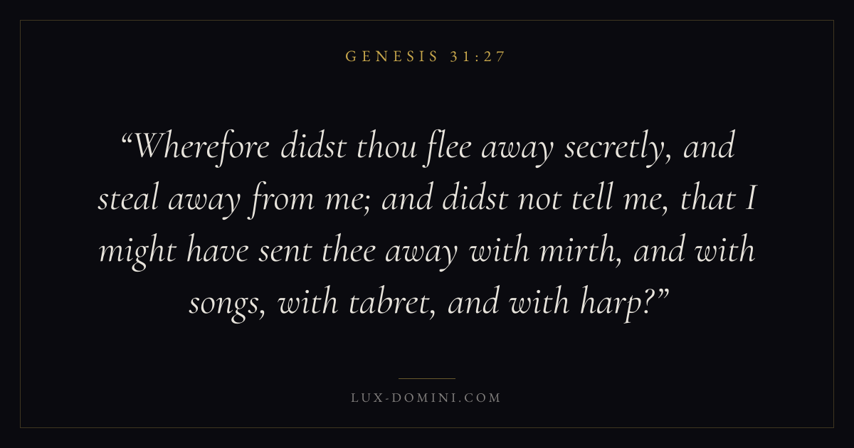 Wherefore didst thou flee away secretly, and steal away from me; and didst not tell me, that I might have sent thee away with mirth, and with songs, with tabret, and with harp?