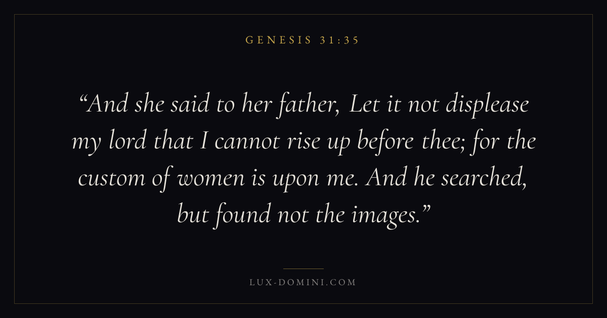 And she said to her father, Let it not displease my lord that I cannot rise up before thee; for the custom of women is upon me. And he searched, but found not the images.