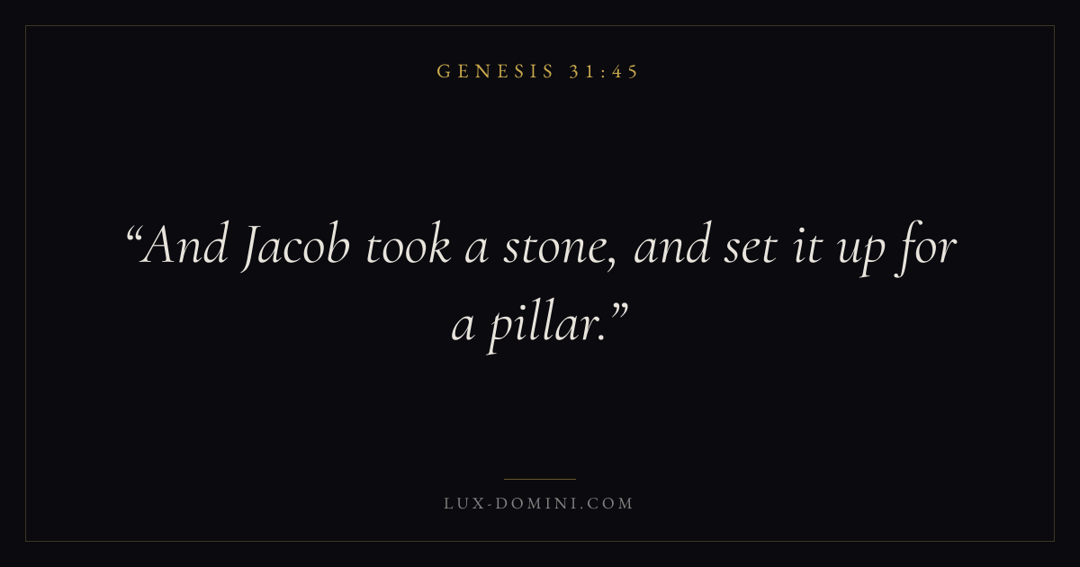 Books / Genesis / Chapter 31 / Verse 45 ← Genesis 31:44 Genesis 31:45 Genesis 31:46 → And Jacob took a stone, and set it up for a pillar. Download verse card Share on Twitter Share on Facebook Pin it ✦ Key themes HopeCreationFallCovenant Read with Genesis 31:43Genesis 31:44Romans 8:24Revelation 21:4 Related topics Bible verses about hope ✦ Genesis Chapter 31 verses V. 1 V. 2 V. 3 V. 4 V. 5 V. 6 V. 7 V. 8 V. 9 V. 10 V. 11 V. 12 V. 13 V. 14 V. 15 V. 16 V. 17 V. 18 V. 19 V. 20 V. 21 V. 22 V. 23 V. 24 V. 25 V. 26 V. 27 V. 28 V. 29 V. 30 V. 31 V. 32 V. 33 V. 34 V. 35 V. 36 V. 37 V. 38 V. 39 V. 40 V. 41 V. 42 V. 43 V. 44 V. 45 V. 46 V. 47 V. 48 V. 49 V. 50 V. 51 V. 52 V. 53 V. 54 V. 55