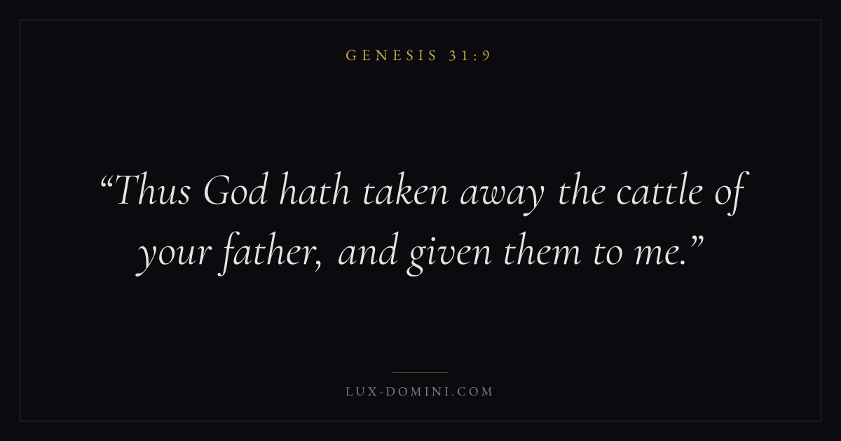 Books / Genesis / Chapter 31 / Verse 9 ← Genesis 31:8 Genesis 31:9 Genesis 31:10 → Thus God hath taken away the cattle of your father, and given them to me. Download verse card Share on Twitter Share on Facebook Pin it ✦ Key themes HopeCreationFallCovenant Read with Genesis 31:10Genesis 31:11Romans 8:24Revelation 21:4 Related topics Bible verses about hope ✦ Genesis Chapter 31 verses V. 1 V. 2 V. 3 V. 4 V. 5 V. 6 V. 7 V. 8 V. 9 V. 10 V. 11 V. 12 V. 13 V. 14 V. 15 V. 16 V. 17 V. 18 V. 19 V. 20 V. 21 V. 22 V. 23 V. 24 V. 25 V. 26 V. 27 V. 28 V. 29 V. 30 V. 31 V. 32 V. 33 V. 34 V. 35 V. 36 V. 37 V. 38 V. 39 V. 40 V. 41 V. 42 V. 43 V. 44 V. 45 V. 46 V. 47 V. 48 V. 49 V. 50 V. 51 V. 52 V. 53 V. 54 V. 55