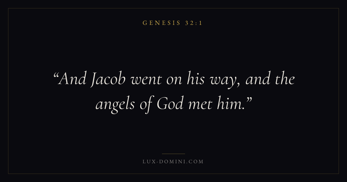Books / Genesis / Chapter 32 / Verse 1 ← Genesis 31:55 Genesis 32:1 Genesis 32:2 → And Jacob went on his way, and the angels of God met him. Download verse card Share on Twitter Share on Facebook Pin it ✦ Key themes HopeCreationFallCovenant Read with Genesis 32:2Romans 8:24Revelation 21:4 Related topics Bible verses about hope ✦ Genesis Chapter 32 verses V. 1 V. 2 V. 3 V. 4 V. 5 V. 6 V. 7 V. 8 V. 9 V. 10 V. 11 V. 12 V. 13 V. 14 V. 15 V. 16 V. 17 V. 18 V. 19 V. 20 V. 21 V. 22 V. 23 V. 24 V. 25 V. 26 V. 27 V. 28 V. 29 V. 30 V. 31 V. 32