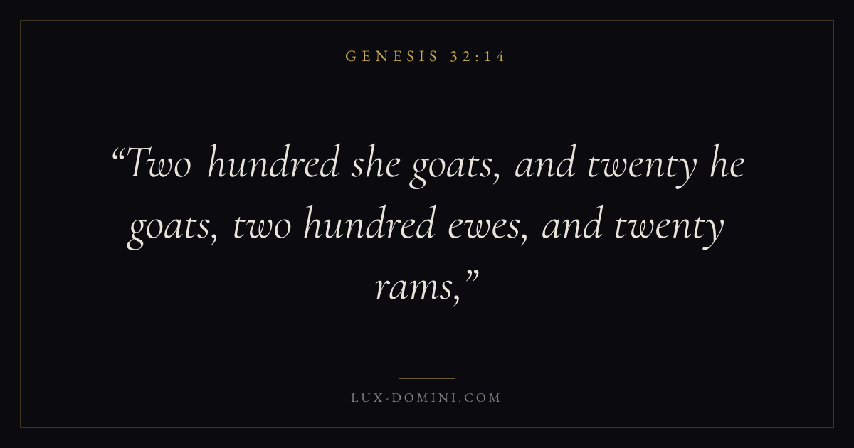 Books / Genesis / Chapter 32 / Verse 14 ← Genesis 32:13 Genesis 32:14 Genesis 32:15 → Two hundred she goats, and twenty he goats, two hundred ewes, and twenty rams, Download verse card Share on Twitter Share on Facebook Pin it ✦ Key themes HopeAnxiety and fearPrayerCreation Read with Genesis 32:13Genesis 32:15Romans 8:24Revelation 21:4 Related topics Bible verses about hopeBible verses about anxiety and fearBible verses about prayer ✦ Genesis Chapter 32 verses V. 1 V. 2 V. 3 V. 4 V. 5 V. 6 V. 7 V. 8 V. 9 V. 10 V. 11 V. 12 V. 13 V. 14 V. 15 V. 16 V. 17 V. 18 V. 19 V. 20 V. 21 V. 22 V. 23 V. 24 V. 25 V. 26 V. 27 V. 28 V. 29 V. 30 V. 31 V. 32