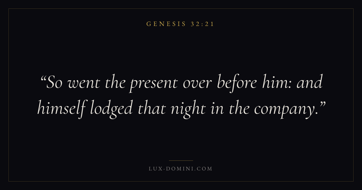 Books / Genesis / Chapter 32 / Verse 21 ← Genesis 32:20 Genesis 32:21 Genesis 32:22 → So went the present over before him: and himself lodged that night in the company. Download verse card Share on Twitter Share on Facebook Pin it ✦ Key themes HopeAnxiety and fearPrayerCreation Read with Genesis 32:18Genesis 32:19Romans 8:24Revelation 21:4 Related topics Bible verses about hopeBible verses about anxiety and fearBible verses about prayer ✦ Genesis Chapter 32 verses V. 1 V. 2 V. 3 V. 4 V. 5 V. 6 V. 7 V. 8 V. 9 V. 10 V. 11 V. 12 V. 13 V. 14 V. 15 V. 16 V. 17 V. 18 V. 19 V. 20 V. 21 V. 22 V. 23 V. 24 V. 25 V. 26 V. 27 V. 28 V. 29 V. 30 V. 31 V. 32